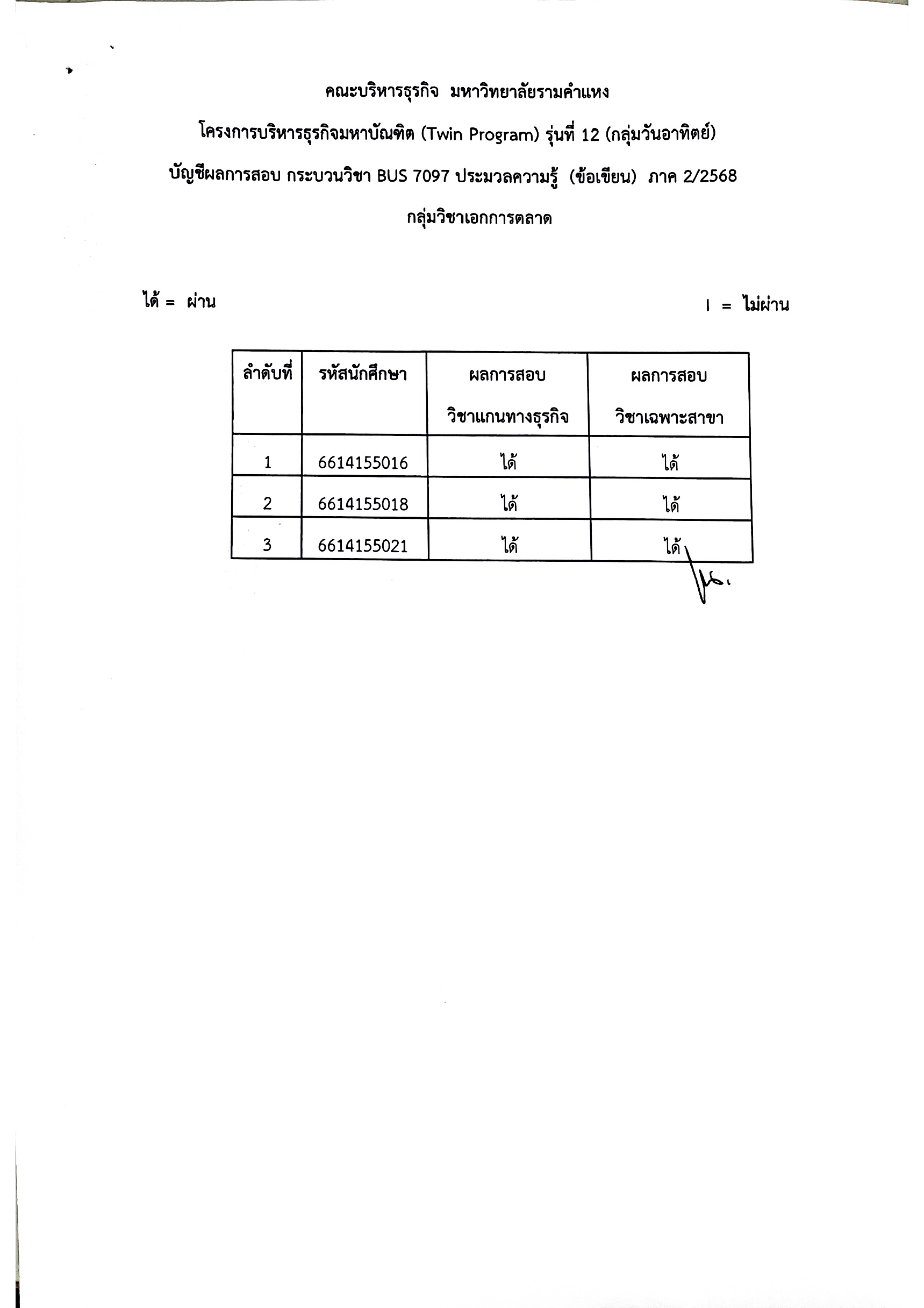 ประกาศผลสอบ วิชา BUS7097 ประมวลความรู้ (ข้อเขียน) ภาค2/2568 -Twin Program รุ่น 12(SUN)