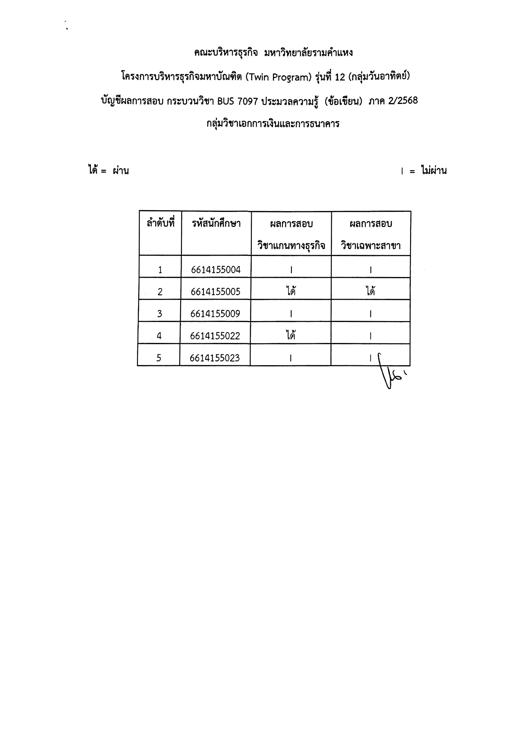 ประกาศผลสอบ วิชา BUS7097 ประมวลความรู้ (ข้อเขียน) ภาค2/2568 -Twin Program รุ่น 12(SUN)