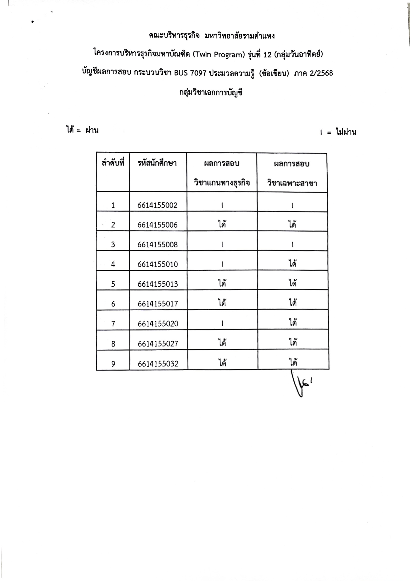ประกาศผลสอบ วิชา BUS7097 ประมวลความรู้ (ข้อเขียน) ภาค2/2568 -Twin Program รุ่น 12(SUN)