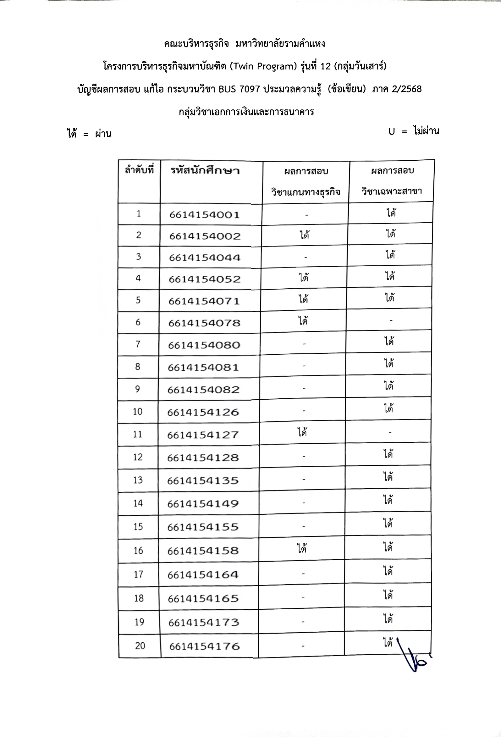 ประกาศผลสอบ แก้ไอวิชา BUS7097 ประมวลความรู้ (ข้อเขียน) -การเงิน-ภาค2/2568 -Twin Program รุ่น 12 (วันเสาร์)