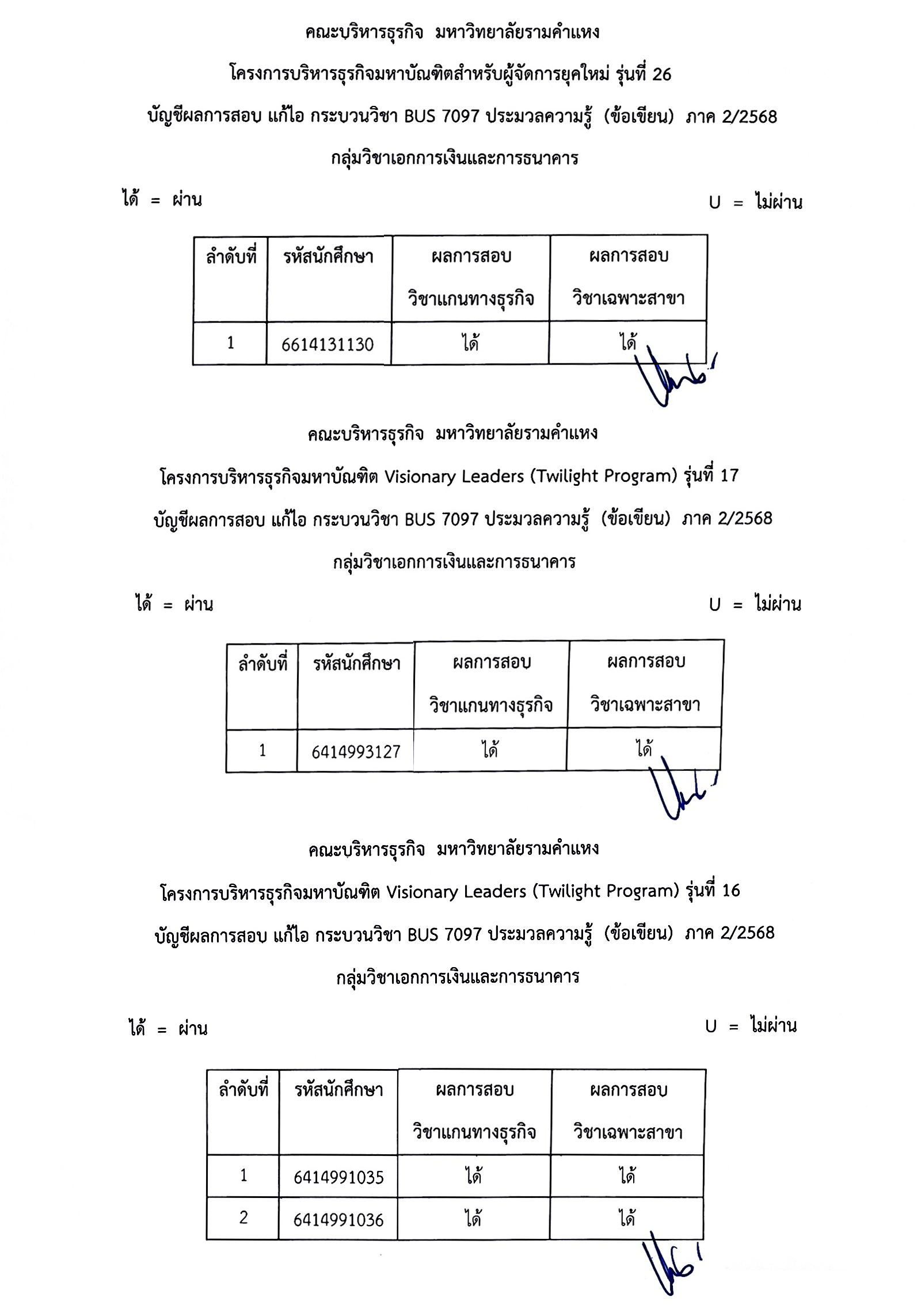 ประกาศผลสอบ แก้ไอวิชา BUS7097 ประมวลความรู้ (ข้อเขียน) -การเงินเพิ่มเติม-ภาค2/2568 -Twin Program รุ่น 12 (วันเสาร์)