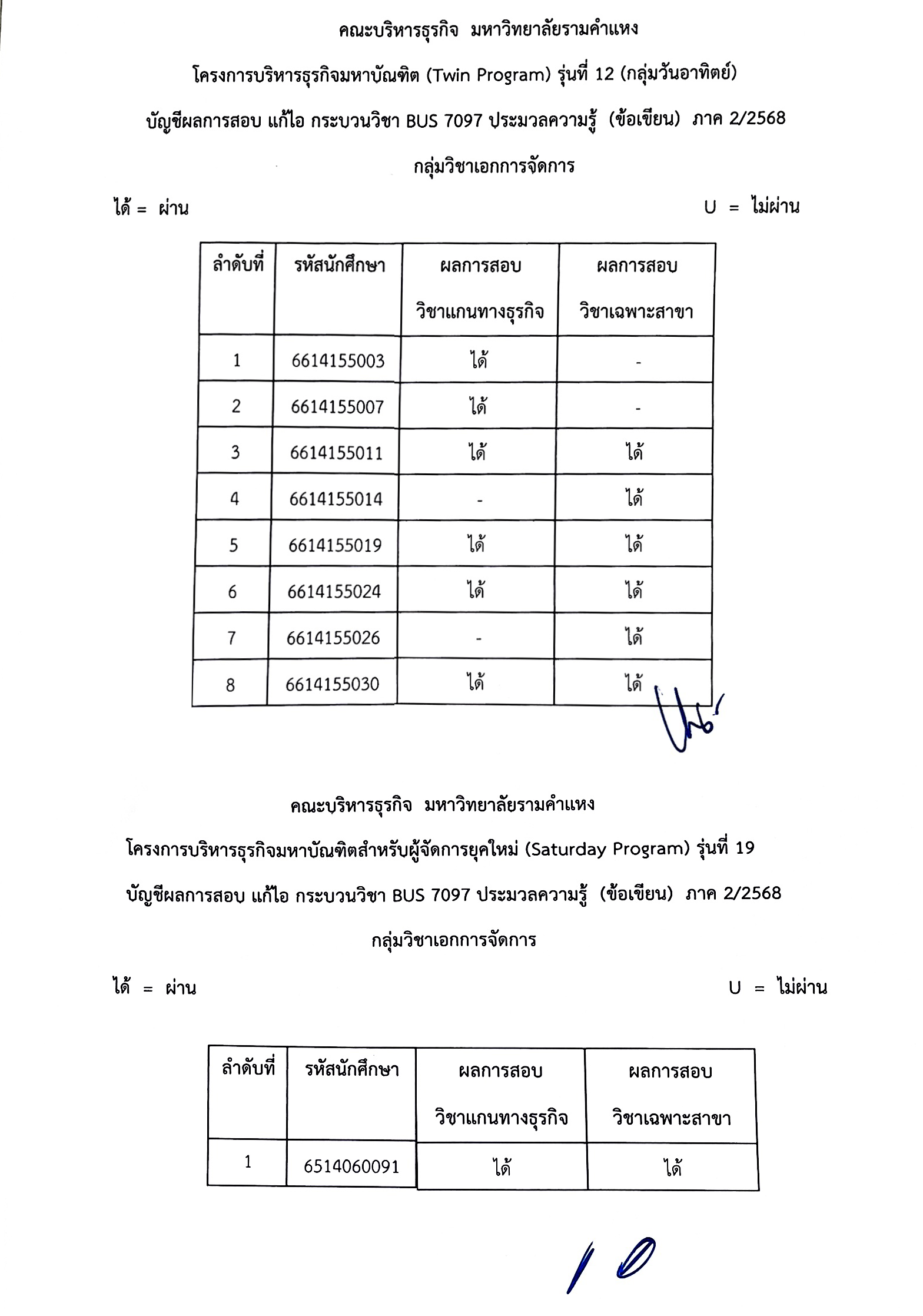 ประกาศผลสอบ แก้ไอวิชา BUS7097 ประมวลความรู้ (ข้อเขียน) -การจัดการ-ภาค2/2568 -Twin Program รุ่น 12 (วันอาทิตย์)