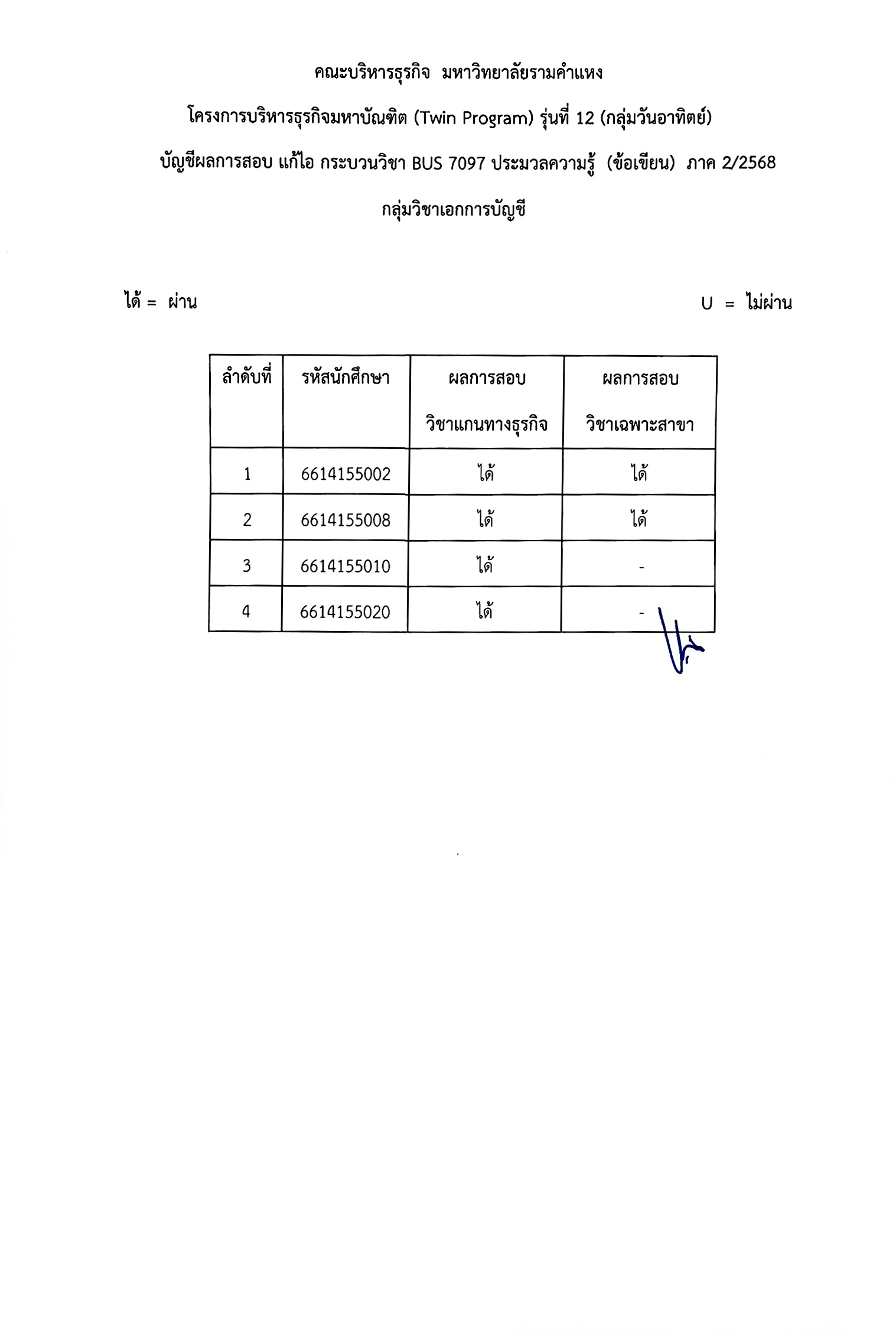 ประกาศผลสอบ แก้ไอวิชา BUS7097 ประมวลความรู้ (ข้อเขียน) -การบัญชี-ภาค2/2568 -Twin Program รุ่น 12 (วันอาทิตย์)